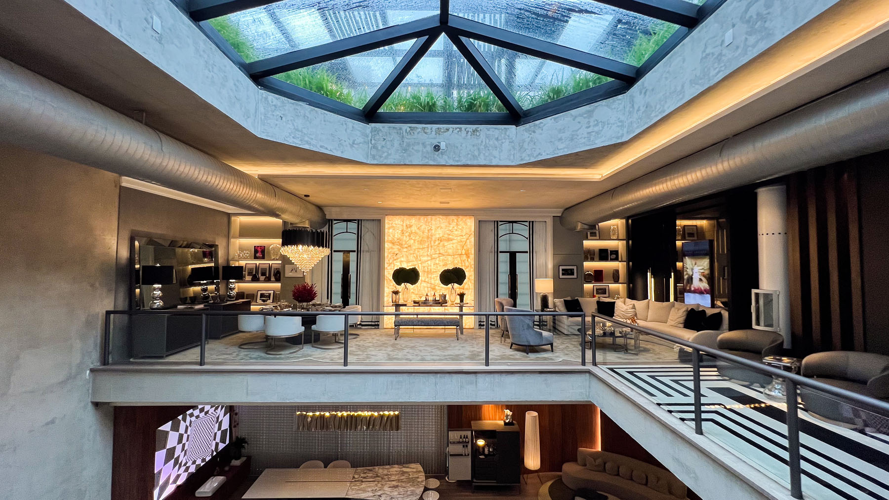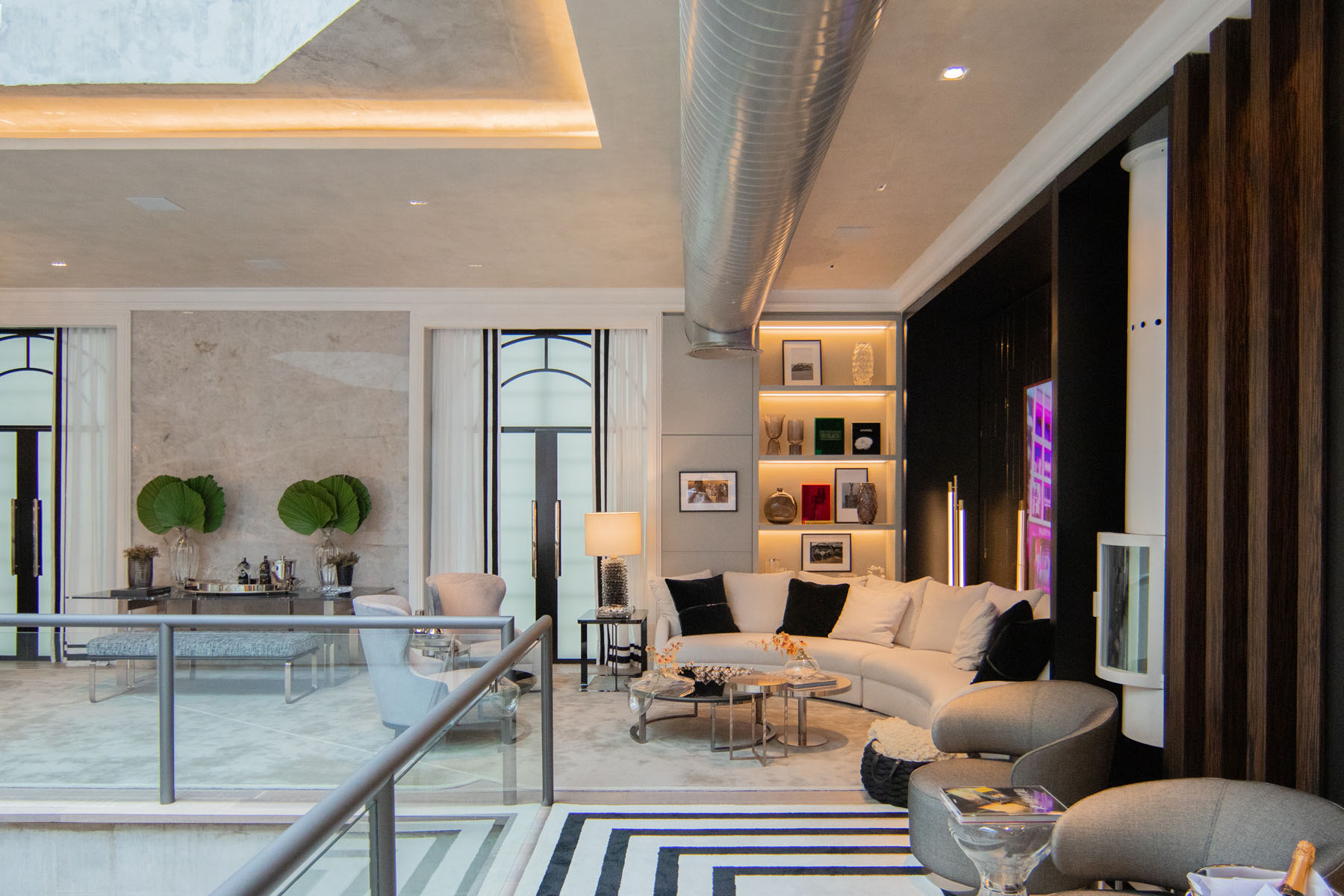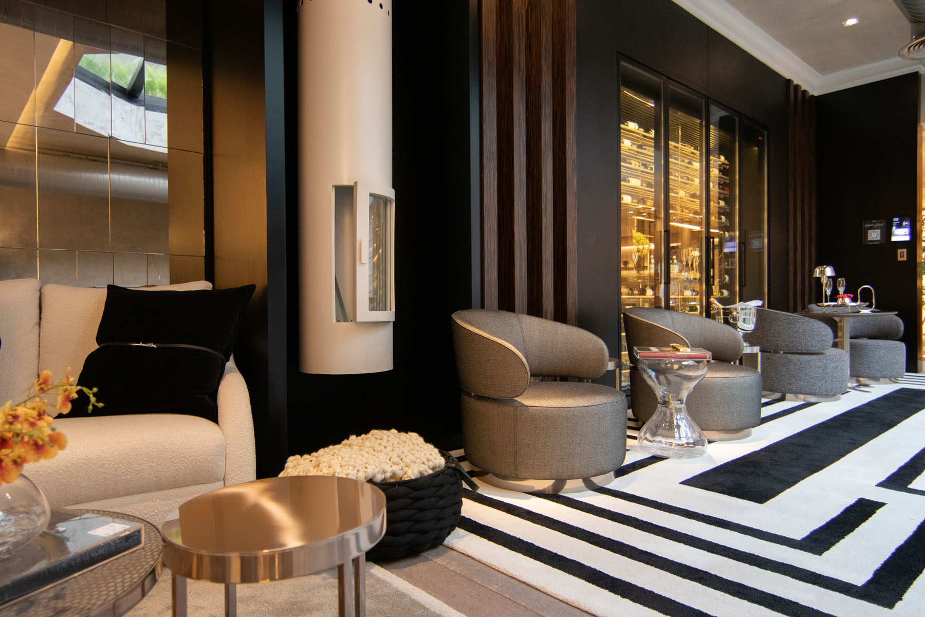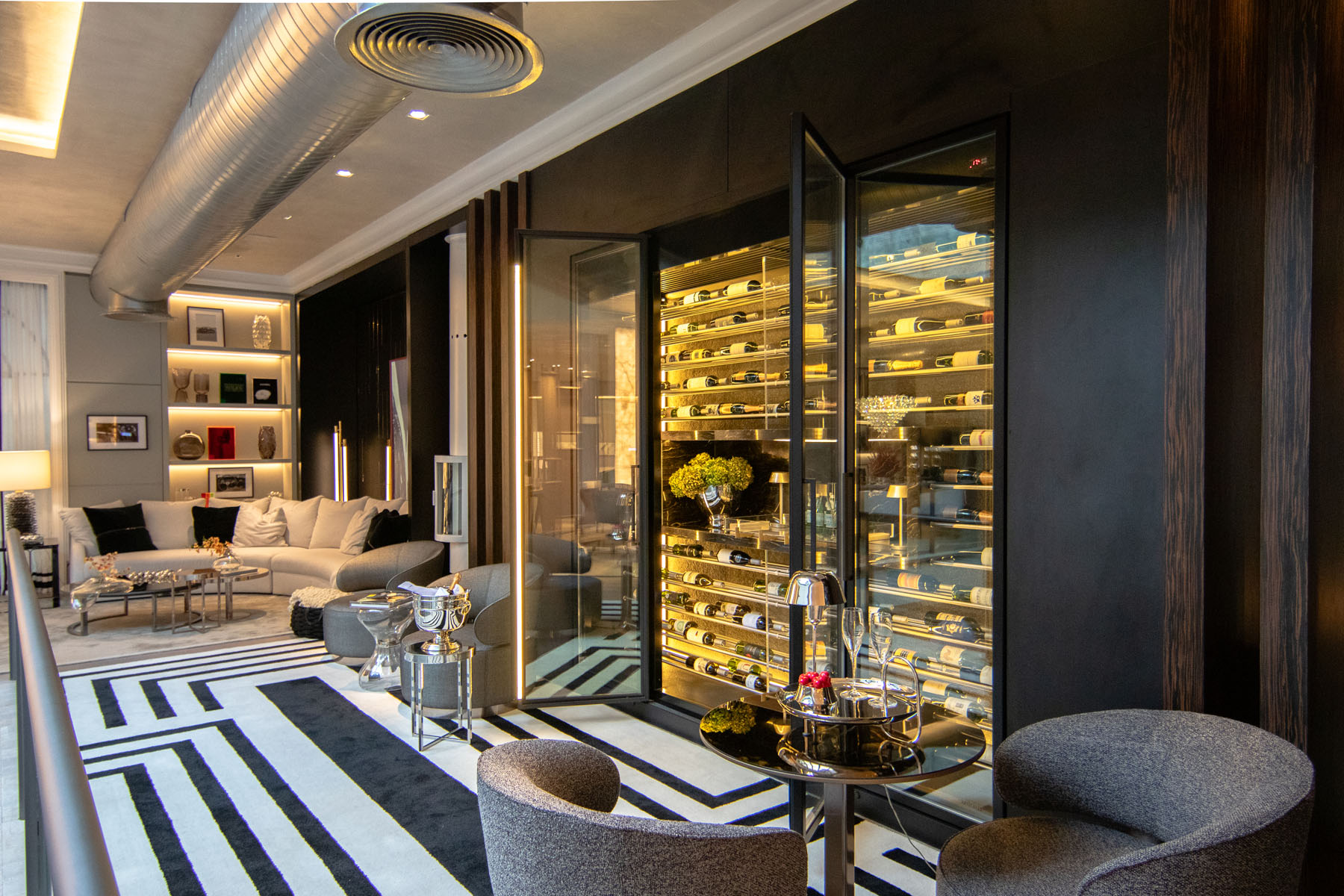 Description: Project of a multifunctional space with a wine cellar, cigar lounge, living area, bar, and dining. The proposal aims to create a journey of relaxation and interaction, highlighting sinuous furniture to provide a fluid and welcoming atmosphere, conveying refinement and sophistication through functional and timeless furniture.