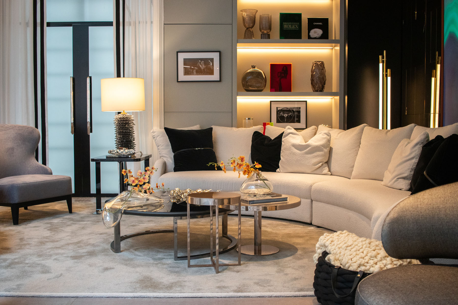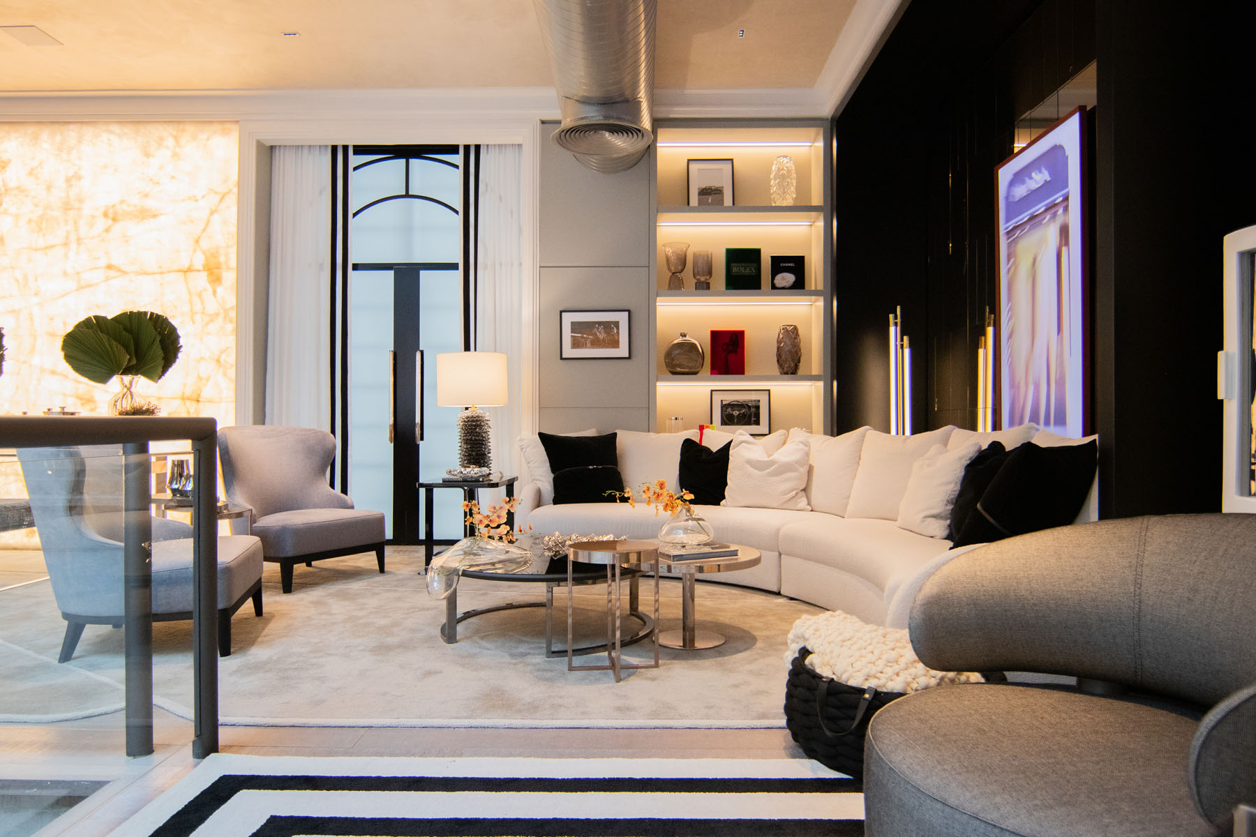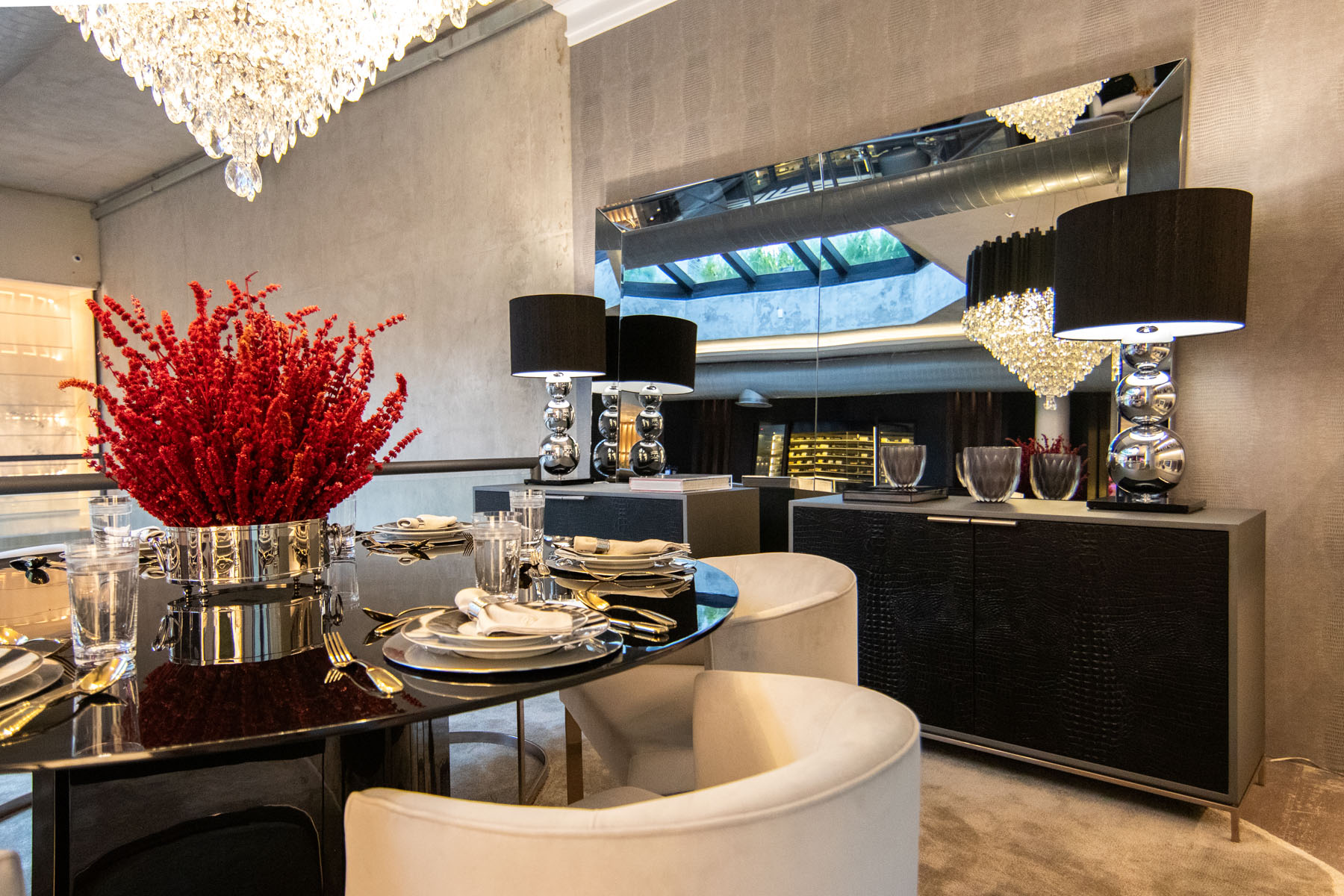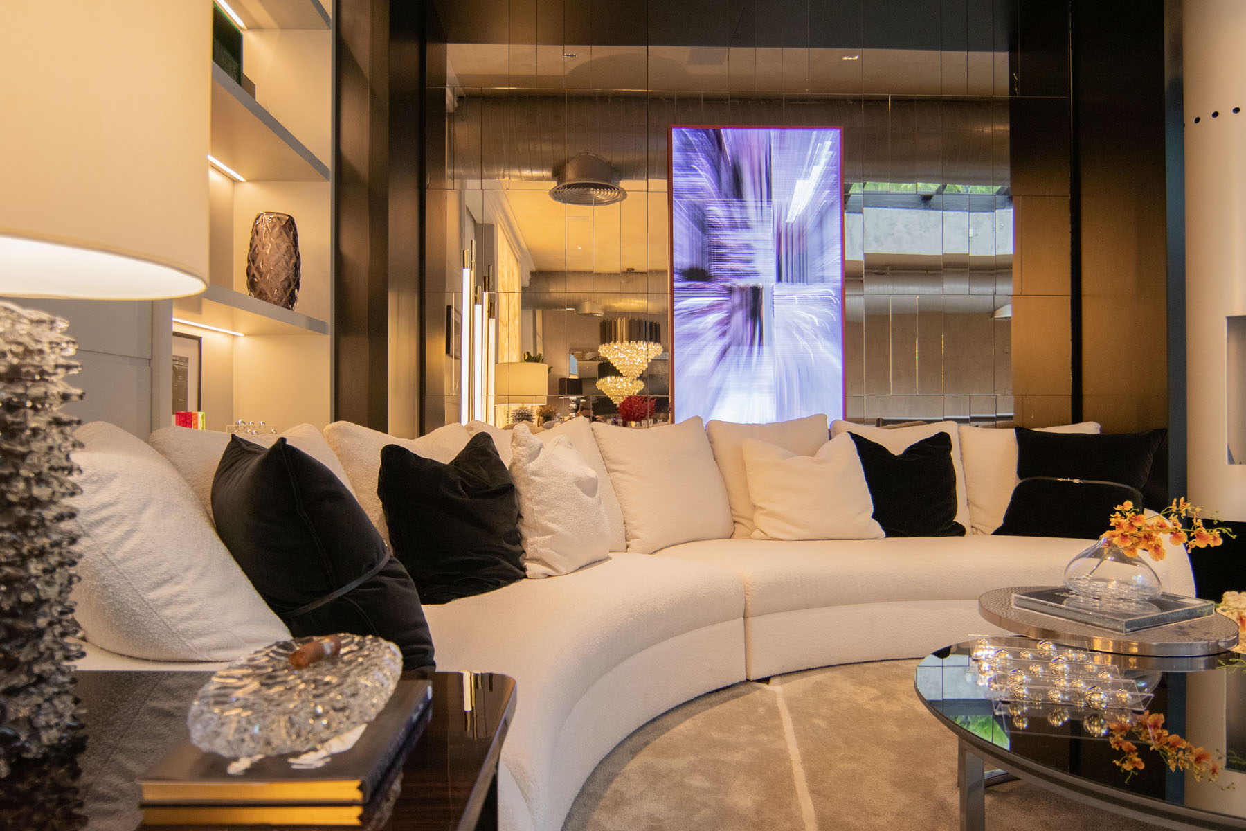 Descrição: Projeto de um ambiente multifuncional com adega, charutaria, living, bar e jantar. A proposta busca criar uma jornada de relaxamento e interação, destacando móveis sinuosos, para proporcionar uma atmosfera fluida e acolhedora, transmitindo requinte e sofisticação através de móveis funcionais e atemporais.